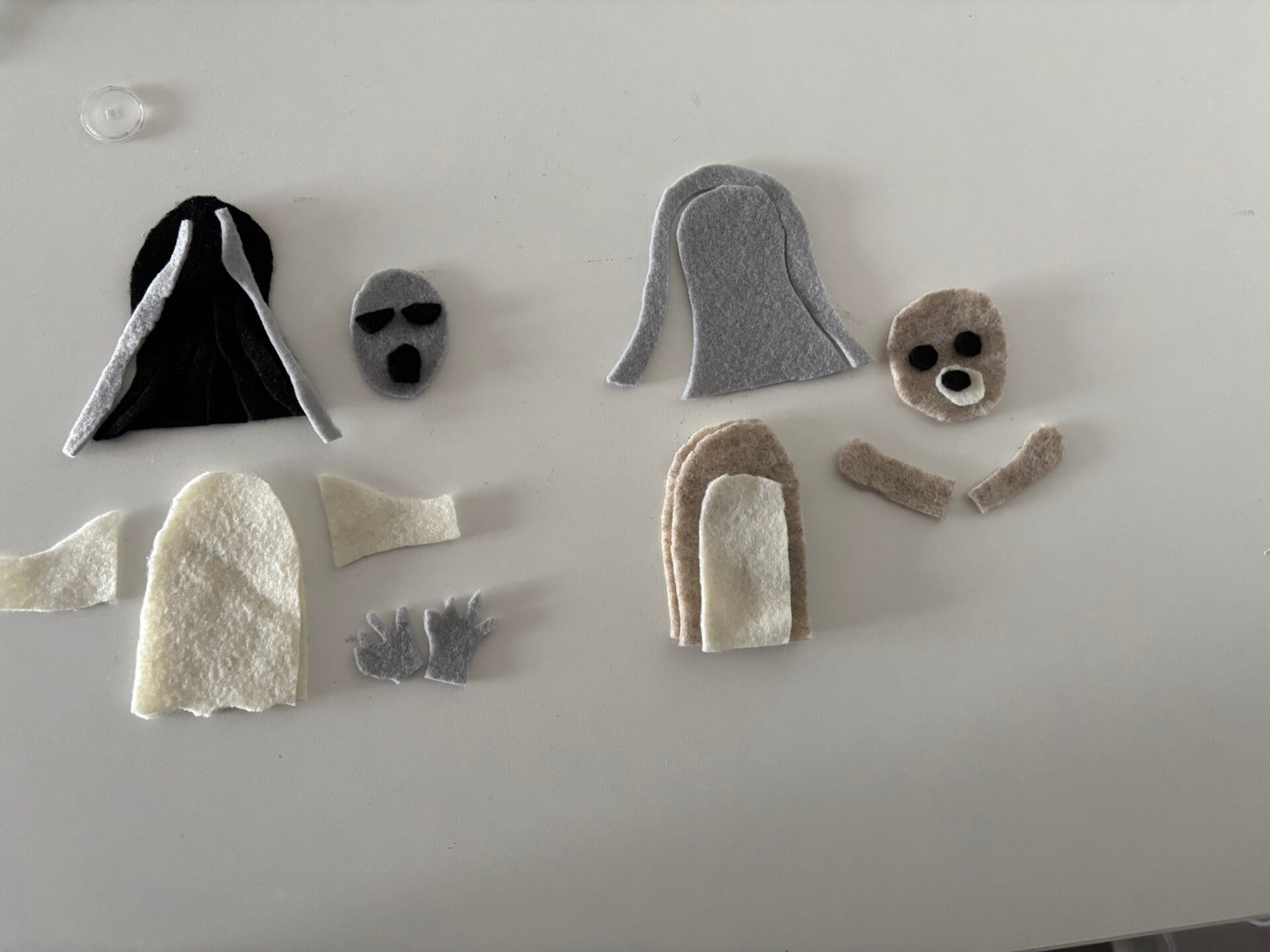 For the selkie puppet, start by cutting out the shape of the body using two pieces of the beige felt. Next with the beige belt also cut out to arms. Then with the white felt cut out the body layer for the body of the selkie, Then also using the beige felt cut out a circular shape for the head. Next with the black felt cut out two small circles for the eyes and a medium sized circle or oblong shape for the nose, then also cut out of small oblong circle shape for the face out of the white felt. And then lastly for the hair cut out a WAVY shape out of the grey felt for the hair and then cut out two weigh these strips out of the grey felt for the hair. Lastly once you have all of the pieces cut start by gluing together the two pieces of the body and then also gluing the arms on and making sure to glue the white center body piece onto the main piece of the beige body felt cut out. Once you have the body together the next step is to glue the head onto the body and then follow by gluing hi the mouthpiece and nose onto the head of the body. Once you have the head and face glued together the last step is to attach the hair glue the big piece to the back of the head and then with the strips that were cut glue those onto the front of the face so that it gives a layered look.